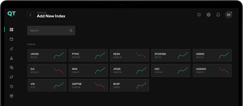 Leverage lets you trade larger index positions with less capital. QT offers up to 1:100.